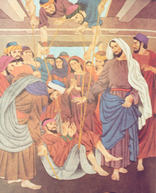 Today's Gospel reminds me of a scene in the classic film about our Lord's life, "Jesus of Nazareth." Jesus is sitting in Peter's home in Capernaum and He is teaching the people. Peter's very small house is totally jammed with people out the door. In the middle of our Lord's discourse, four men burrow a gaping hole in the roof of Peter's house and begin lowering down their paralytic friend to the feet of Jesus, begging Him to heal their friend. While Jesus is impressed with their great faith, Peter is livid - they just ruined his roof! Then the miracle of the healing of the paralytic ensues. There are so many wonderful details in this story that we should take note of today: