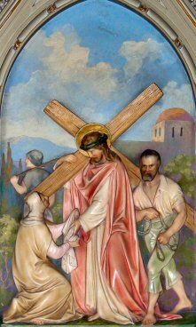 Consider the compassion of the holy woman, Veronica. Seeing Jesus in such distress, His face bathed in sweat and blood, she presented Him with her veil. Jesus wiped His face, and left upon the cloth the image of His sacred countenance.