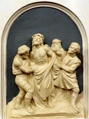 Jesus is stripped of his garments. Clothing gives a man his social position; it gives him his place in society, it makes him someone. His public stripping means that Jesus is no longer anything at all, he is simply an outcast, despised by all alike. The moment of the stripping reminds us of the expulsion from Paradise: God’s splendor has fallen away from man, who now stands naked and exposed, unclad and ashamed. And so Jesus once more takes on the condition of fallen man. Stripped of his garments, he reminds us that we have all lost the ”first garment” that is God’s splendor. At the foot of the Cross, the soldiers draw lots to divide his paltry possessions, his clothes. The Evangelists describe the scene with words drawn from Psalm 22:19; by doing so they tell us the same thing that Jesus would tell his disciples on the road to Emmaus: that everything takes place “according to the Scriptures”. Nothing is mere coincidence; everything that happens is contained in the Word of God and sustained by his divine plan. The Lord passes through all the stages and steps of man’s fall from grace, yet each of these steps, for all its bitterness, becomes a step towards our redemption: this is how he carries home the lost sheep. Let us not forget that John says that lots were drawn for Jesus’ tunic, “woven without seam from top to bottom” (Jn 19:23). We may consider this as a reference to the High Priest’s robe, which was “woven from a single thread”, without stitching (Fl. Josephus, a III, 161). For he, the Crucified One, is the true High Priest.