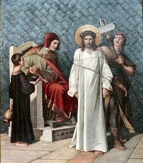 In Greek and Latin, the two international languages of the time, and in Hebrew, the language of the chosen People, a sign stood above the Cross of Jesus, indicating who he was: the King of the Jews, the promised Son of David.  Pilate, the unjust judge, became a prophet despite himself.  The kingship of Jesus was proclaimed before all the world.  Jesus himself had not accepted the title “Messiah,” because it would have suggested a mistaken, human idea of power and deliverance.  Yet now the title can remain publicly displayed above the Crucified Christ.  He is indeed the king of the world.  Now he is truly “lifted up.”