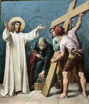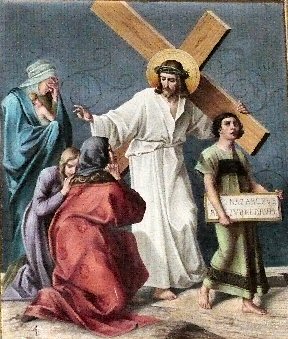 Hearing Jesus reproach the women of Jerusalem who follow him and weep for him ought to make us reflect.  How should we understand his words?  Are they not directed as a piety which is purely sentimental, one which fails to lead to conversion and living faith?  It is no use to lament the sufferings of this world if our life goes on as usual.  And so the Lord warns us of the danger in which we find ourselves.  He shows us both the seriousness of sin and the seriousness of judgment.  Can it be that, despite all our expressions of consternation in the face of evil and innocent suffering, we are all too prepared to trivialize the mystery of evil?  Have we accepted only the gentleness and love of God and Jesus, and quietly set aside the word of judgment?  :”How can God be so concerned with our weaknesses?”, we say.  “We are only human!”  Yet as we contemplate the sufferings of the Son, we see more clearly the seriousness of sin, and how it needs to be fully atoned if it is to be overcome.  Before the image of the suffering Lord, evil can no longer be trivialized.  To us too, he says: “Do not weep for me, weep for yourselves… if they do this when the wood is green, what will happen when it is dry?”.