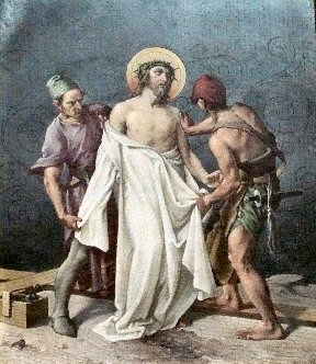 Jesus is stripped of his garments.  Clothing gives a man his social position; it gives him his place in society, it makes him someone.  His public stripping means that Jesus is no longer anything at all, he is simply an outcast, despised by all alike.  The moment of the stripping reminds us of the expulsion from Paradise: God’s splendor has fallen away from man, who now stands naked and exposed, unclad and ashamed.  And so Jesus once more takes on the condition of fallen man.  Stripped of his garments, he reminds us that we have all lost the ”first garment” that is God’s splendor.  At the foot of the Cross, the soldiers draw lots to divide his paltry possessions, his clothes.  The Evangelists describe the scene with words drawn from Psalm 22:19; by doing so they tell us the same thing that Jesus would tell his disciples on the road to Emmaus: that everything takes place “according to the Scriptures”.  Nothing is mere coincidence; everything that happens is contained in the Word of God and sustained by his divine plan.  The Lord passes through all the stages and steps of man’s fall from grace, yet each of these steps, for all its bitterness, becomes a step towards our redemption: this is how he carries home the lost sheep.  Let us not forget that John says that lots were drawn for Jesus’ tunic, “woven without seam from top to bottom” (Jn 19:23).  We may consider this as a reference to the High Priest’s robe, which was “woven from a single thread”, without stitching (Fl. Josephus, a III, 161).  For he, the Crucified One, is the true High Priest.