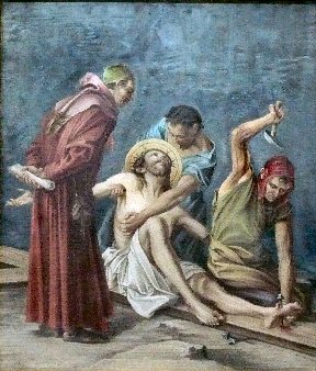 Jesus is nailed to the Cross.  The shroud of Turin gives us an idea of the unbelievable cruelty of this procedure.  Jesus does not drink the numbing gall offered to him: he deliberately takes upon himself all the pain of the Crucifixion.  His whole body is racked; the words of the Psalm have come to pass: “But I am a worm and no man, scorned by men, rejected by the people” (Ps 22:7).  “As one from whom men hide their faces, he was despised… surely he has borne our grief and carried our sorrows” (Is 53:3f).  Let us halt before this image of pain, before the suffering Son of God.  Let us look upon him at times of presumptuousness and pleasure, in order to learn to respect limits and to see the superficiality of all merely material goods.  Let us look upon him at times of trial and tribulation, and realize that it is then that we are closest to God.  Let us try to see his face in the people we might look down upon.  As we stand before the condemned Lord, who did not use his power to come down from the Cross, but endured its suffering to the end, another thought comes to mind.  Ignatius of Antioch, a prisoner in chains for his faith in the Lord, praised the Christians of Smyrna for their invincible faith: he says that they were, so to speak, nailed with flesh and blood to the Cross of the Lord Jesus Christ (1:1).  Let us nail ourselves to him, resisting the temptation to stand apart, or to join others in mocking him.