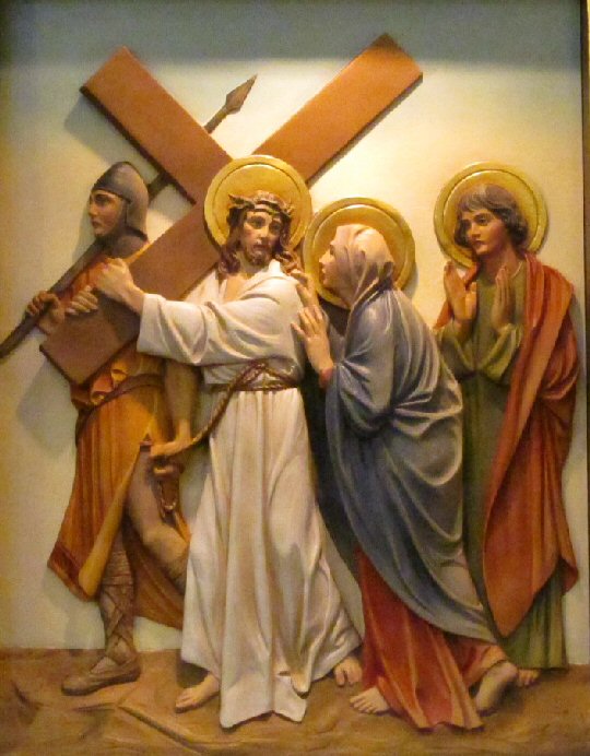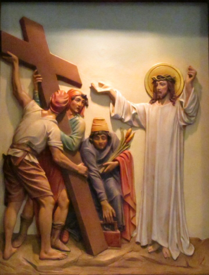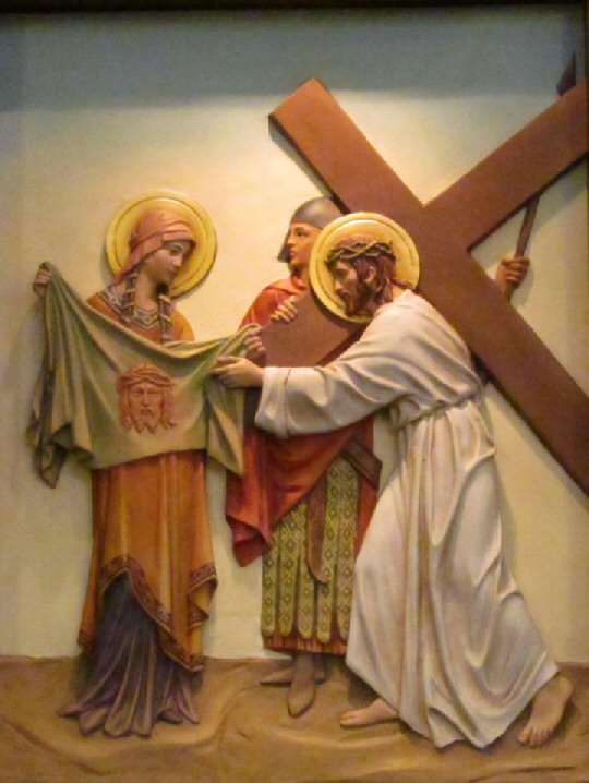 Consider how this woman tried to lessen the sufferings of Jesus, and how he rewarded her by leaving the print of His sacred face on the towel she had in her hands.