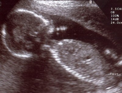 A hospital sonogram image of a human child in its mother's womb soon to be born.