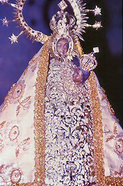 The story of the origin of the image of the Virgin begins with the search of a young Frenchman named Simon Vela who heard a voice telling him to go to the Peņa de Francia where he would find an image of the Virgin. He searched throughout Western France for many years with no success. Finally, he traveled to Spain and one day chanced to overhear a conversation which mentioned the very location he sought. In a dream, he was instructed to look in a particular region where he and several companion witnesses moved a large stone sealing the entrance of a cave. Inside, he found the icon of his quest which was found to have been placed there about 711 A.D. Immediately the medical conditions of he and his companions were cured and recorded as true by the local Spanish authorities.