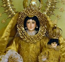 The original image dates from about 1590 when it was brought to the Philippines from Spain by way of Mexico. It is said that in 1610, a man walking home heard a Lady's mysterious voice and looking around saw a beautiful Lady with a Rosary holding a child. She stood on a cloud which hovered above a treetop. He told the people of his vision and soon a church was built on the spot. The Virgin's call to the man became associated with the name of the town, "Manaoag," which means, "She Calls."