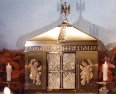 The Priest Approaches and Kisses the Altar: The altar is a symbol of Christ. In it are cut five crosses to recall the five wounds of Christ. The altar also represents the Church and has embedded in it the relics of her saints. The priest comes to the altar to celebrate the Sacrifice in the Church's name. Because of the glory surrounding the altar upon which the divine Sacrifice will be made, the kiss of the priest unites the Church to Christ, its Redeemer.