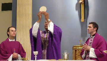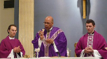 The Gospel:  The Liturgy of the Word is completed by the reading of the Gospel.  Before its reading, the members of the assembly trace the sign of the cross upon the forehead to indicate their mental acceptance of the Truth, on the lips to indicate their readiness to announce it, and over the heart to indicate their sincere desire to accept it into their lives.  The "Good News" of the Gospel tells that God's kingdom has come for all to hear, accept, and announce to the world for its salvation.  It is God who is speaking to us.  Christ comes to teach us by the example of His life and by His own words.