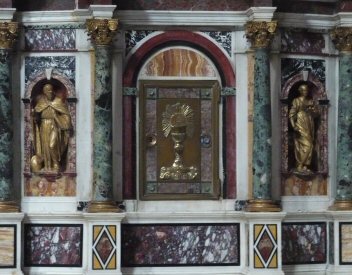 The Priest Approaches and Kisses the Altar:  The altar is a symbol of Christ.  In it are cut five crosses to recall the five wounds of Christ.  The altar also represents the Church and has embedded in it the relics of her saints.  The priest comes to the altar to celebrate the Sacrifice in the Church's name.  Because of the glory surrounding the altar upon which the divine Sacrifice will be made, the kiss of the priest unites the Church to Christ, its Redeemer.